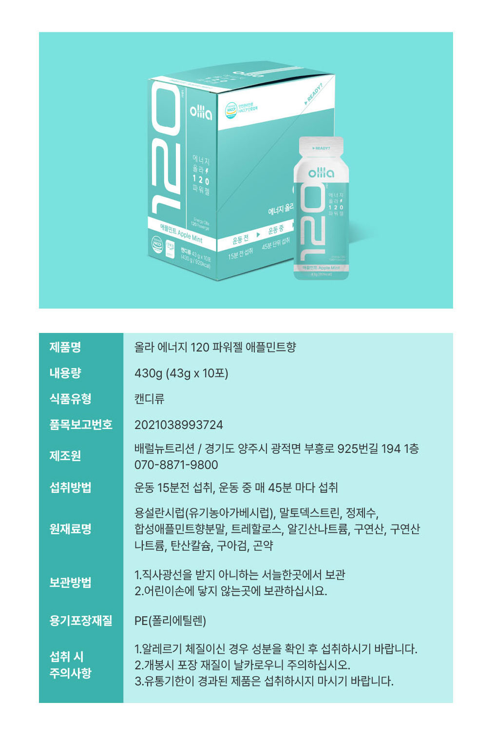 | 올라 120 파워젤 (애플민트맛) : 1회 제공량 (1포) 43g 92kcal |