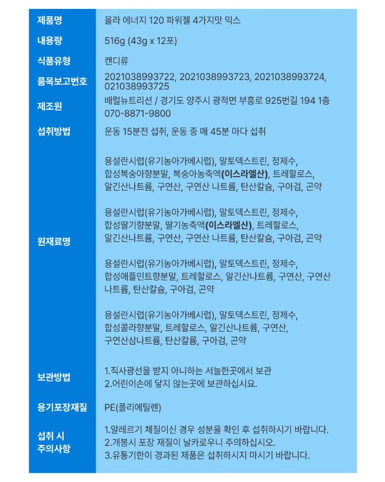 | 올라 120 에너지젤 (믹스) : 1회 제공량 (1포) 43g 92kcal |