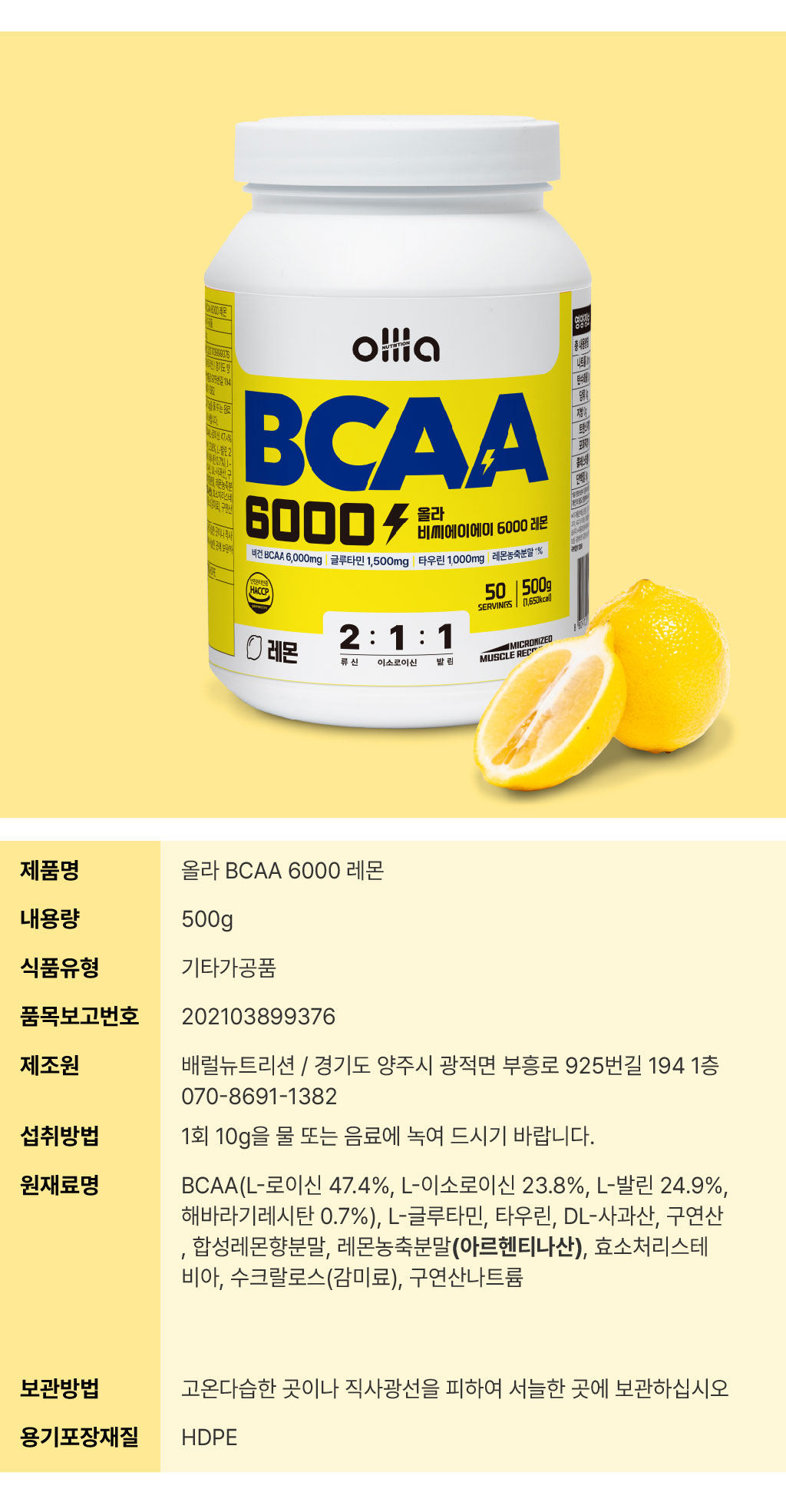 올라 BCAA 6000 (레몬) : 1회 제공량 (1스쿱) 10g 33kcal |