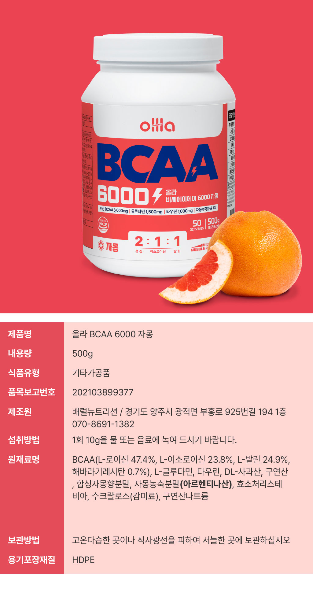 올라 BCAA 6000 (자몽) : 1회 제공량 (1스쿱) 10g 33kcal |