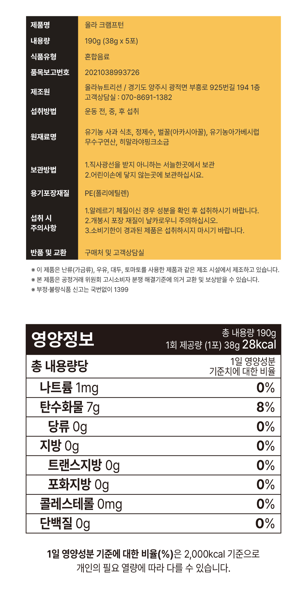 | 올라 크램프턴 : 1회 제공량 (1포) 38g 12kcal |