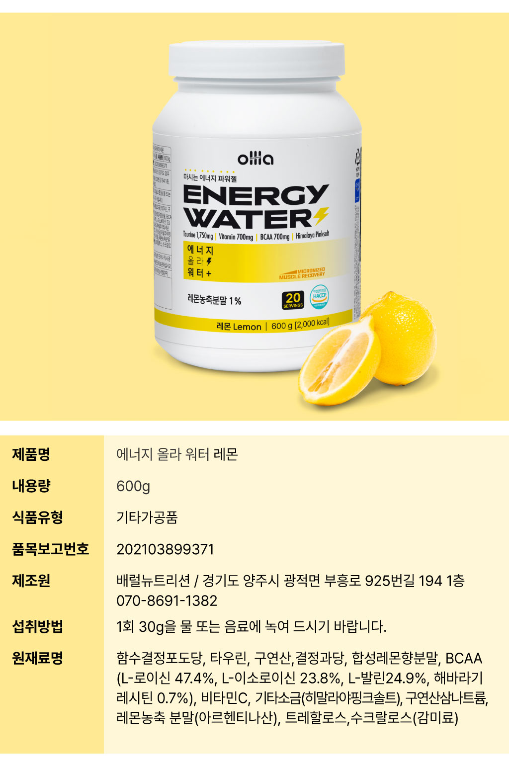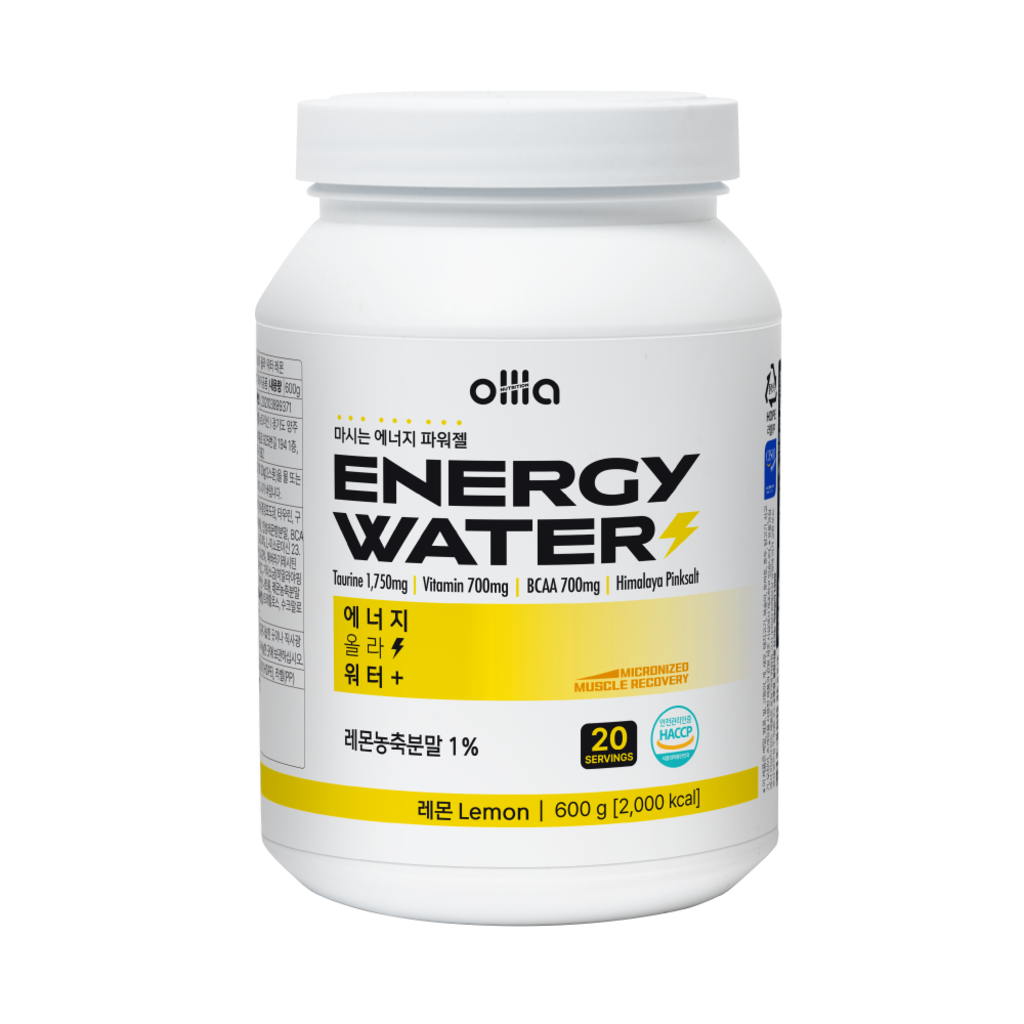 올라 마시는 에너지 워터 (레몬맛) : 600g (20회분) 1회 제공량 (1스쿱) 15g x 2 100kcal |
